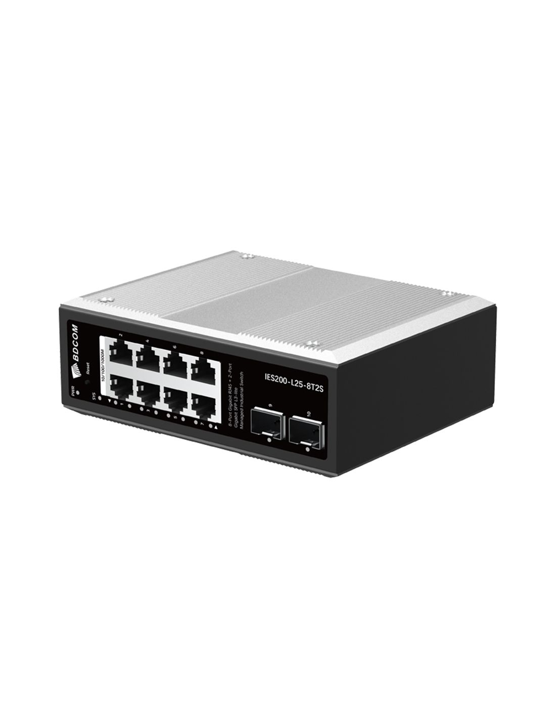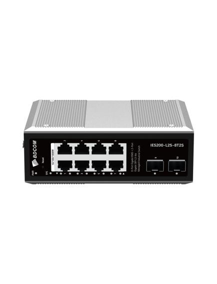 Коммутатор, BDCOM, IES200-L25-8T2S, Управляемый L3-lite, 8 портов 10/100/1000 RJ45, 2 порта SFP, DC 12-55В Dual RPS, вход DC12V, -40+75°C, DIN-rail