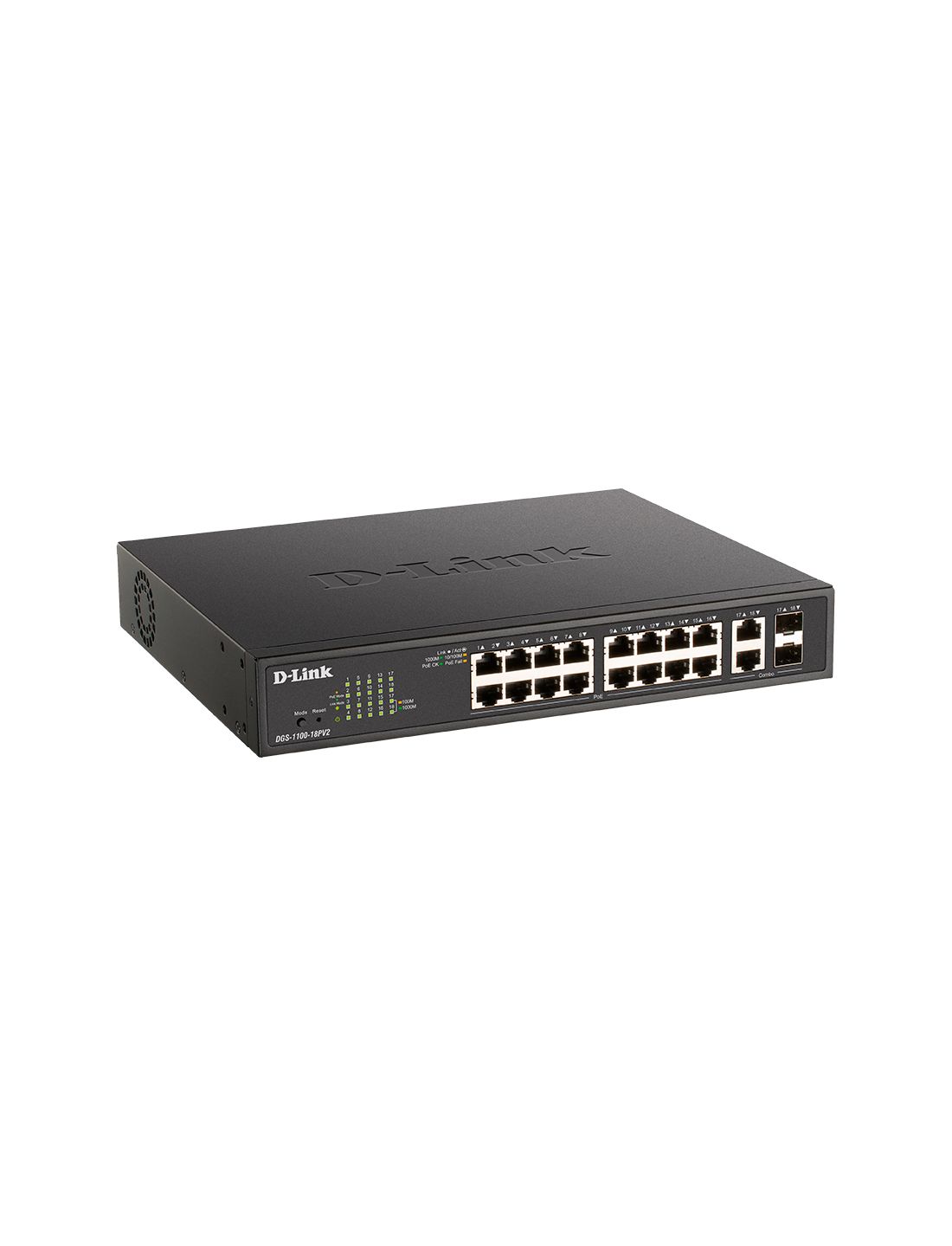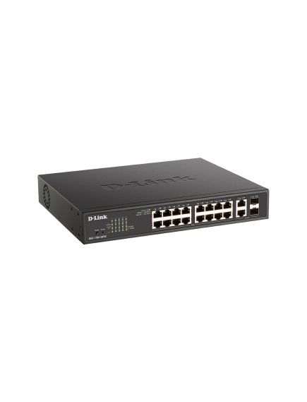 Коммутатор, D-Link, DGS-1100-18PV2/A3A, Настраиваемый L2, 16 портов 10/100/1000Base-T RJ45, 2 комбо-порта 1000Base-T/SFP, 16 портов PoE 802.3af/at, PoE-бюджет 130 Вт, 1U