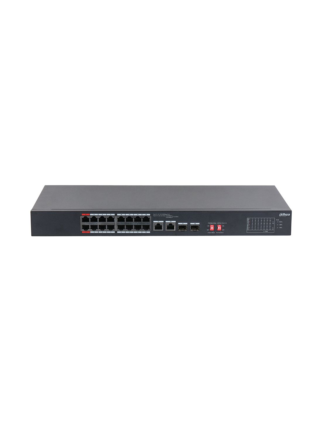 Коммутатор, Dahua, DH-S3218-16ET-135, Неуправляемый, 16 портов RJ-45 (10/100 Мбит/с, PoE), 2 порта RJ-45 (10/100/1000 Мбит/с, uplink, комбинированный), 2 порта SFP (1000 Мбит/с, uplink, комбинированный), 802.3af/at/bt порт 1 ~ 2: ≤90 Вт, порт 3 ~ 16: ≤30 Вт, общая: ≤135 Вт, стоечный