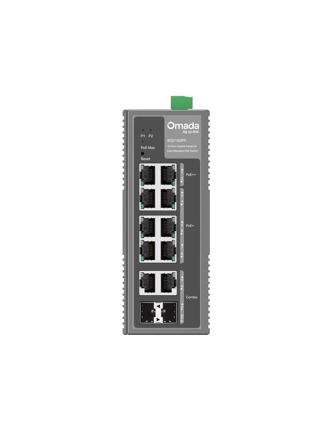 Коммутатор, TP-Link, IES210GPP, 2× порта RJ45 PoE++ 10/100/1000 Мбит/с, 6× портов RJ45 PoE+ 10/100/1000 Мбит/с, 2×комбо SFP/RJ45, 802.3af/at/bt, бюджет 240 Вт